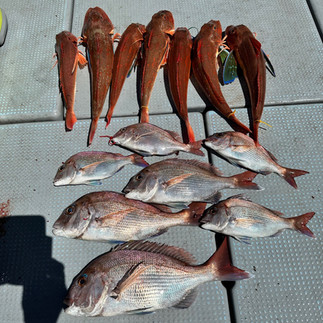 釣果ですが、鯛は7枚〜ホウボウ11本(写真は7本でクーラーに4本)でした。